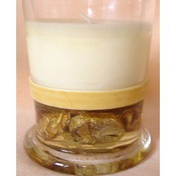 Verre avec incorporation de fruits dorés dans le gel et au-dessus une bougie en cire.