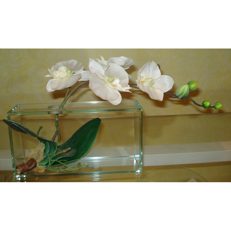 Rectangle horizontal en verre avec en décoration une orchidée blanche en tissu.