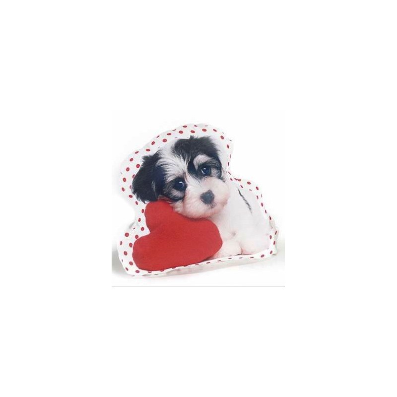 Coussin avec photo d'un chiot noir et blanc reposant sa petite frimousse sur un coeur rouge.