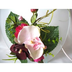 Lampe d'intérieur électrique à poser sur un meuble. Elle est composée de 2 verres opaques entre lesquels se situe une ampoule. Le premier verre est décoré d'un bouquet de fleurs en tissu.
