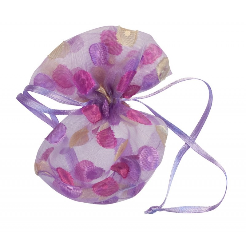 Bourse à dragées en organdi lilas avec petits pois violet, prune, or en satin et ruban en satin lilas pour fermeture.